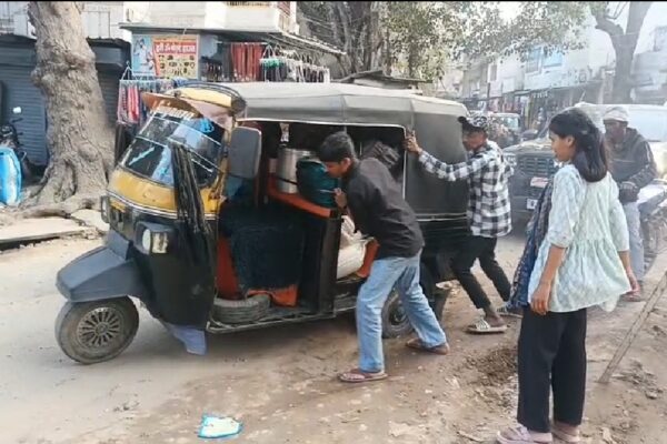 डूंगरपुर: सीवरेज कार्य बना सिरदर्द, महारावल स्कूल के पास गड्ढे में फंसा ऑटो; घंटों लगा रहा जाम